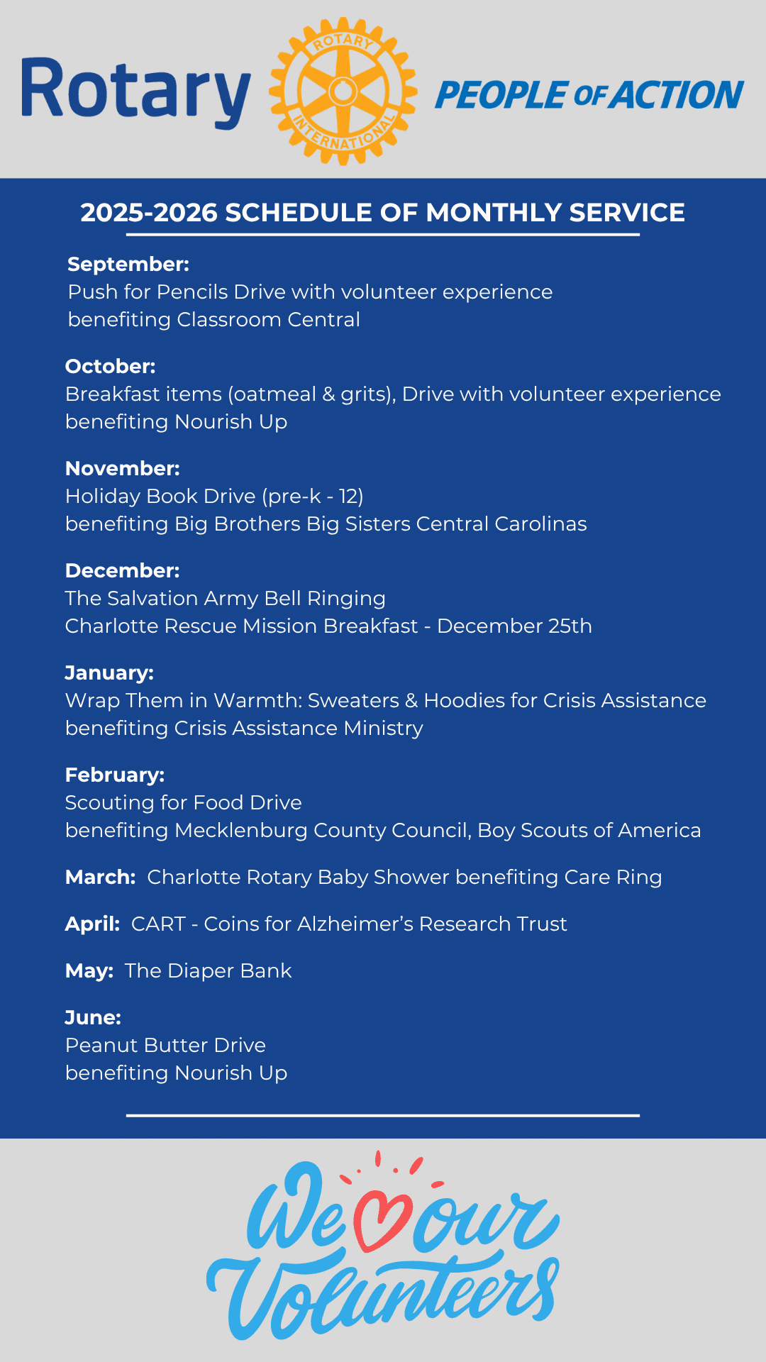 A dedicated Rotarian since 2005, Patrick was a long-standing member of the Durham Rotary Club before joining the Rotary Club of Charlotte. He is passionate about Rotary’s mission and values, particularly the Four-Way Test, and is committed to fostering meaningful connections, promoting service, and cultivating an inclusive and engaged club culture.